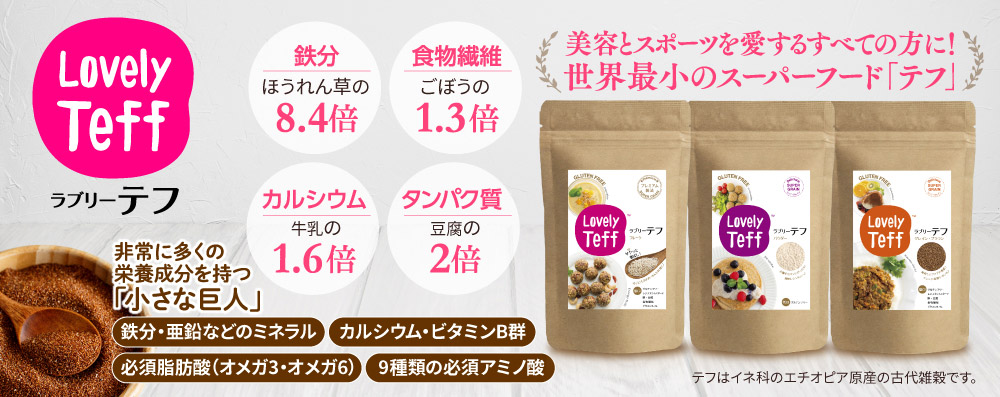 Trend Online is the official online store for "Lovely Teff," an original brand of Teff, the world's smallest superfood, and an original Japanese-made supplement lavishly blended with rare herb extracts carefully selected from Peru in South America, such as Maca, Miska Miska, Cat's Claw, and Hercampure.
